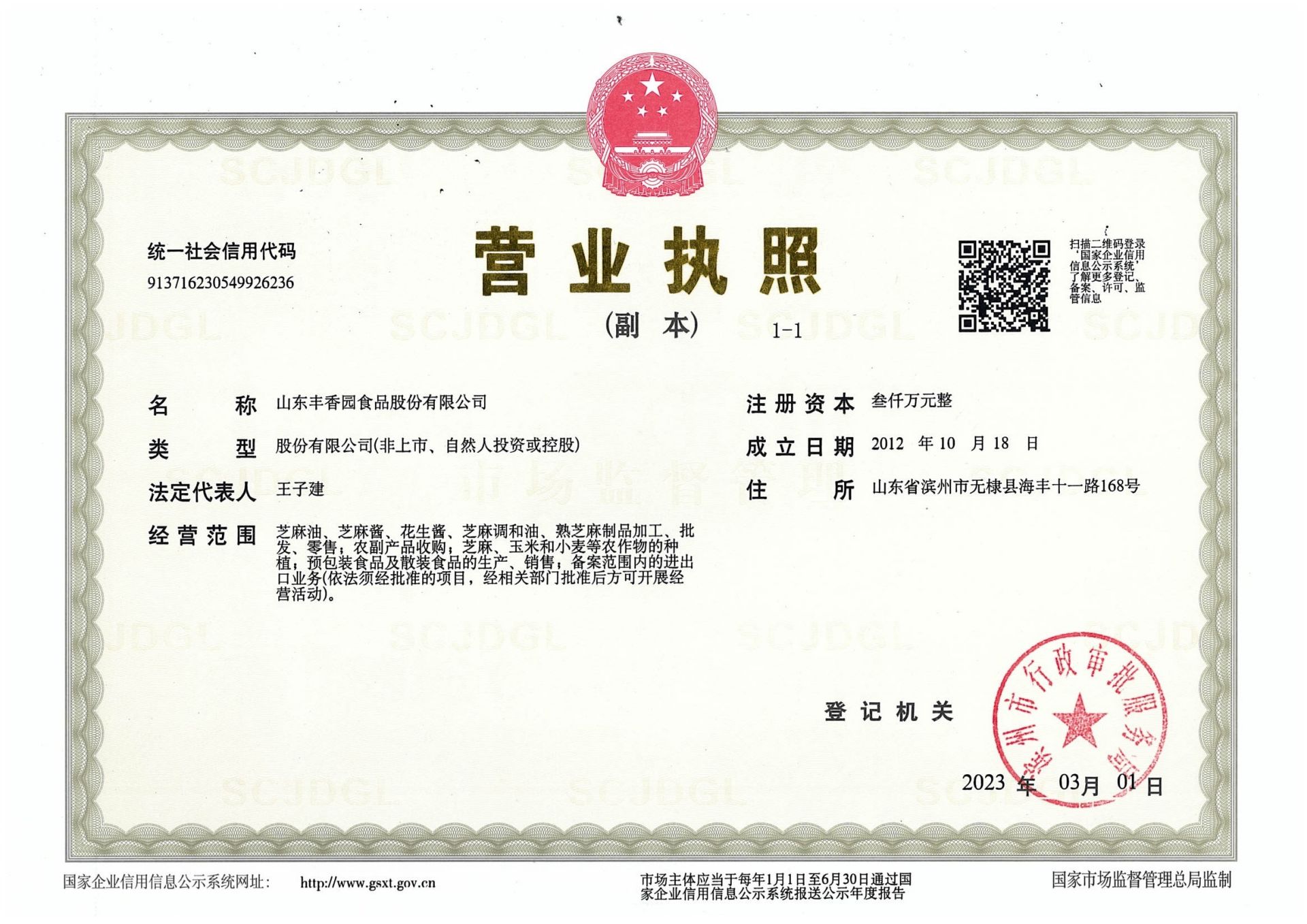 山東豐香園食品股份有限公司位于無棣縣西城工業園,成立于2012年,注冊資本3000萬元,員工60多人,年銷售收入8000多萬元,是“國家高新技術企業”、“中國好糧油”示范企業、“食安山東”示范生產加工企業,公司集綠色、有機芝麻食品標準化、生產加工、研發(fā)、出口銷售為一體的山東省農業產業化“重點龍頭企業”。